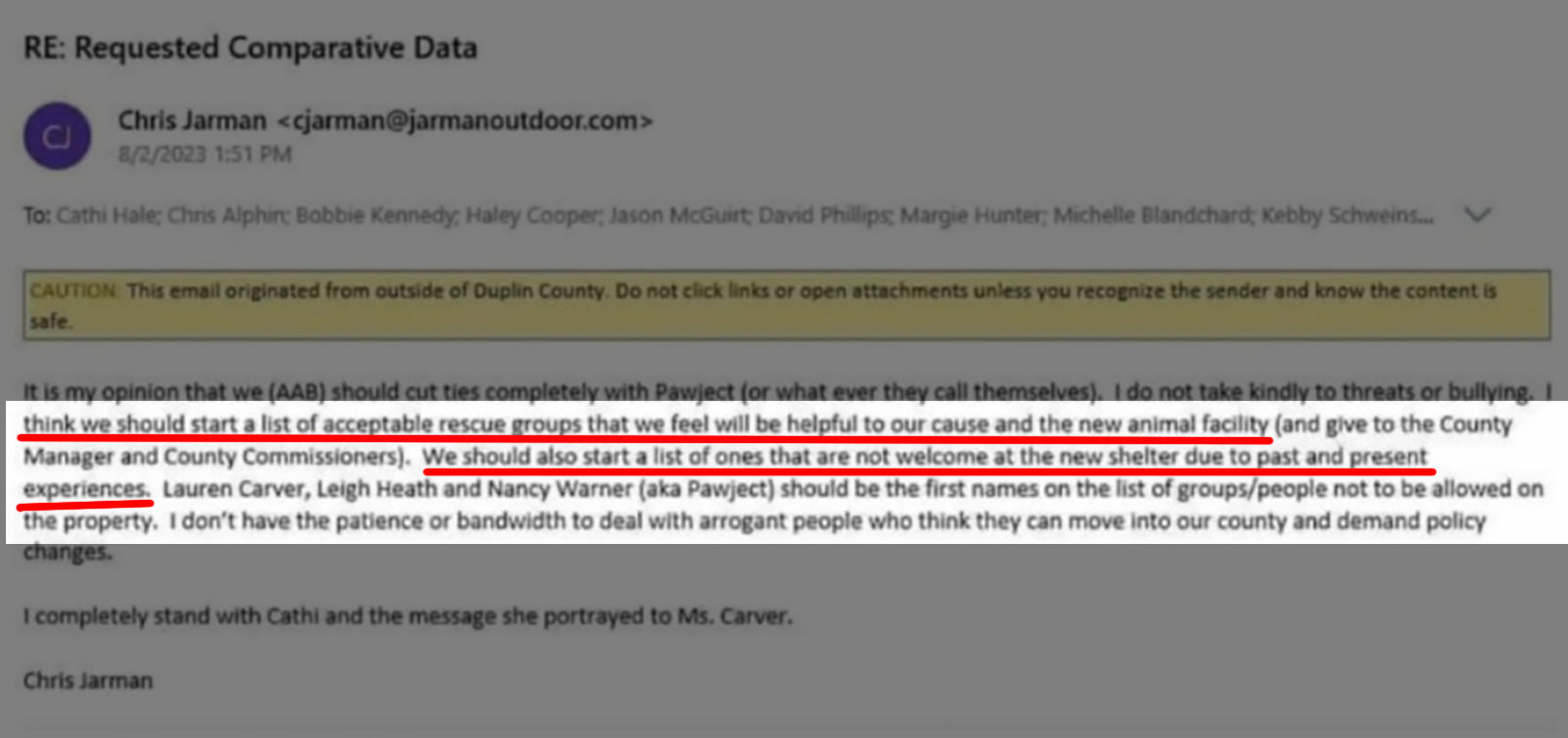 An email from a member of the Duplin County Animal Advisory Board shared with Duplin Journal shows a member recommending to ban individuals/volunteers from the new shelter before it opened, and recommended creating a list of acceptable rescue groups they “feel will be helpful” to their cause.