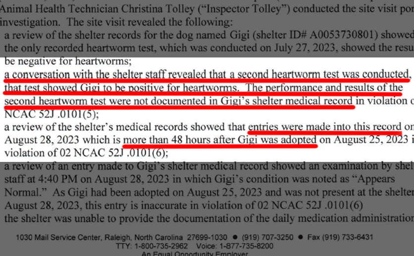Investigators found multiple inconsistencies, “including the absence of documentation for a second heartworm test that shelter staff said had returned a positive result. The only recorded heartworm test, which was conducted on July 27, 2023, showed the result to be negative for heartworms,” stated the report. Investigators also discovered that entries were added to Gigi’s medical record three days after her adoption and included an inaccurate notation stating she appeared “normal” on a date when she was no longer in the shelter’s custody.