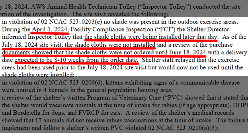 An April 1, 2024, inspection report obtained by Duplin Journal noted that the then shelter director told the state inspector that “the shade cloths were being installed later that day. As of the July 18, 2024, site visit, the shade cloths were not installed and a review of the purchase documents showed that the shade cloths were not ordered until June 18, 2024, with a delivery date expected to be 8-10 weeks from the order date.”
