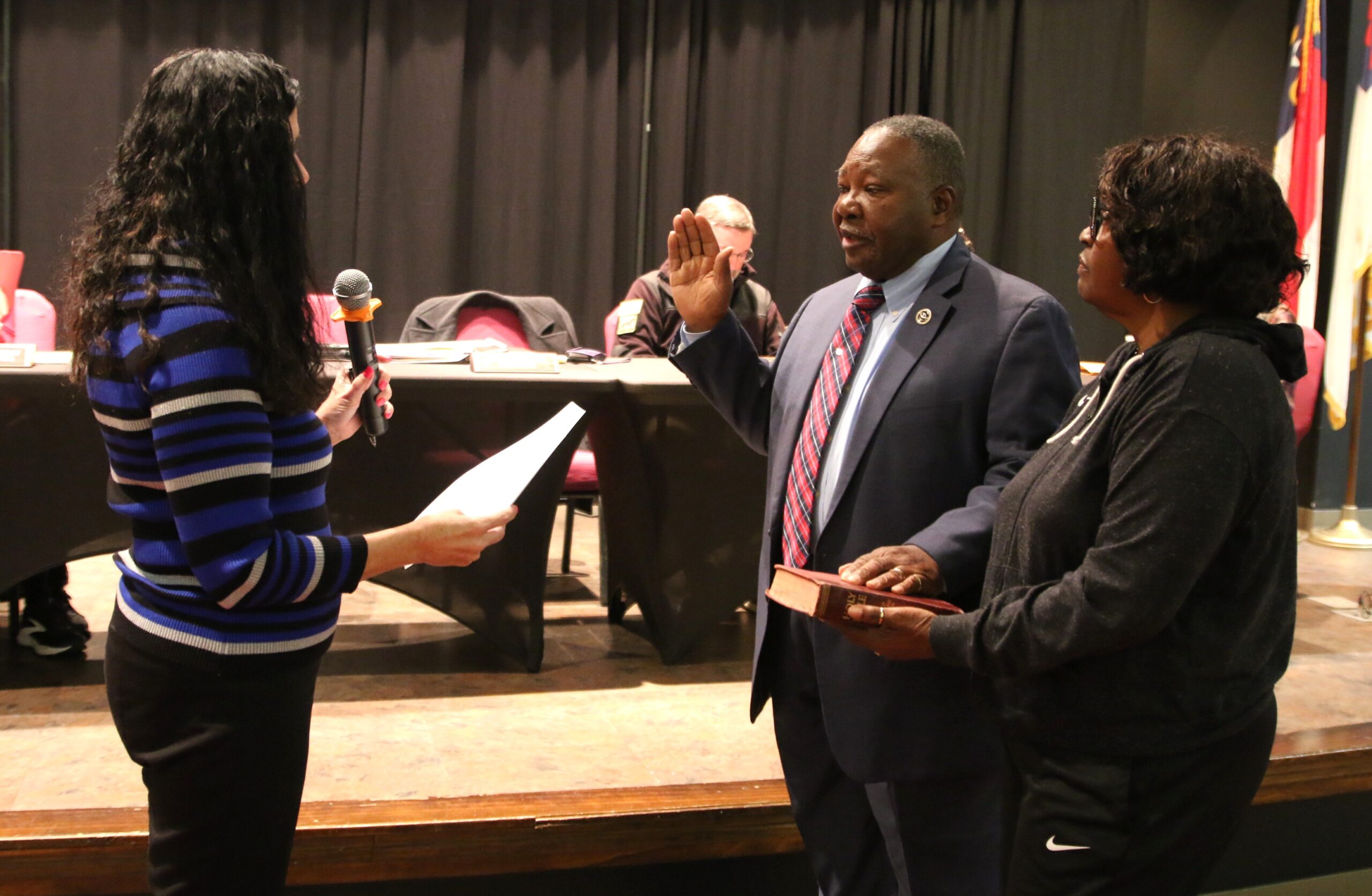 Town Clerk Sherry Davis administered the oaths to the three new commissioners. Mayor Jerome Newton was sworn in for his new term by N.C. House District 10 Rep. John Bell. After being selected as mayor pro tem, Simmons also requested that Bell administer his oath.