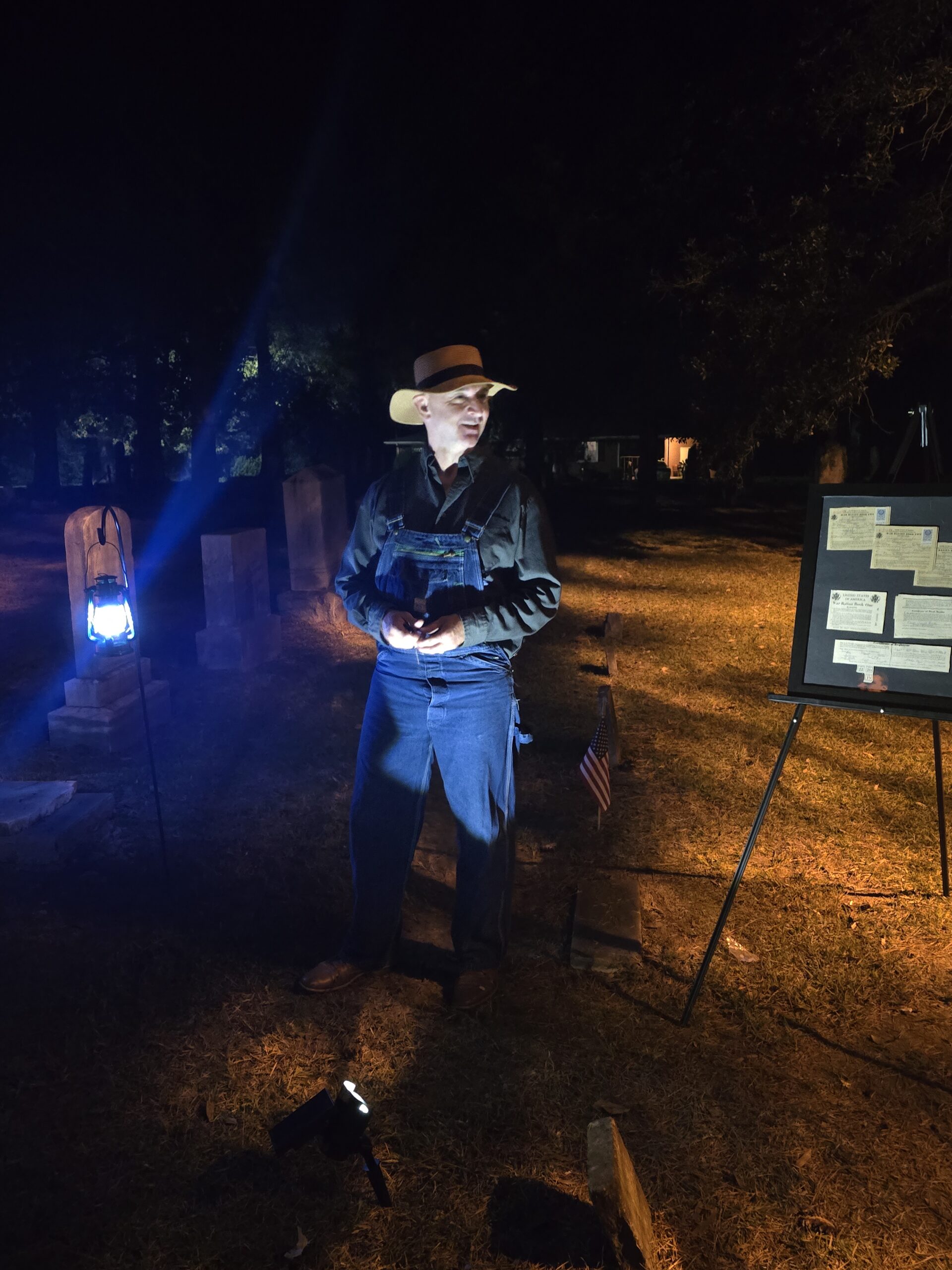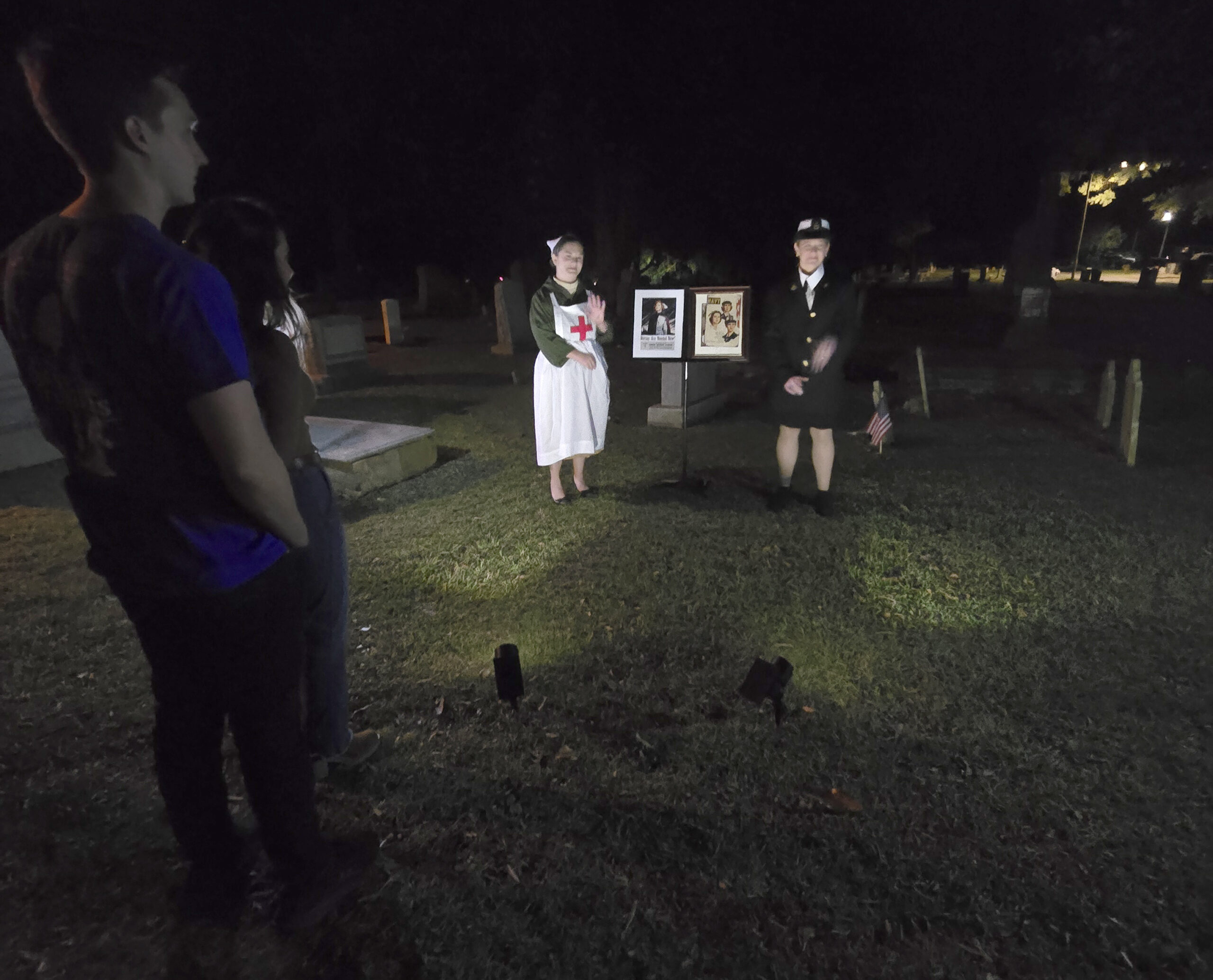 The family-friendly tour started with an air warden played by Bryan Bullard, who explained Eastern North Carolina’s role in World War II. During his interactive discussion, the tours moved forward in a straight line through tombstones, with lights on the ground illuminating the way. The actors were set up in individual stations along the route to tell their stories. All the actors wore period dress, with props and, in some cases, accents to bring their characters to life.